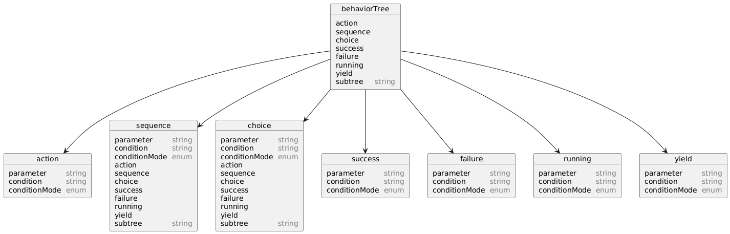 | subtree | Load behavior tree using path from tag text content. Subtree is added to the behavior tree as a sequence rule containing the loaded behavior tree | 0..N | - |